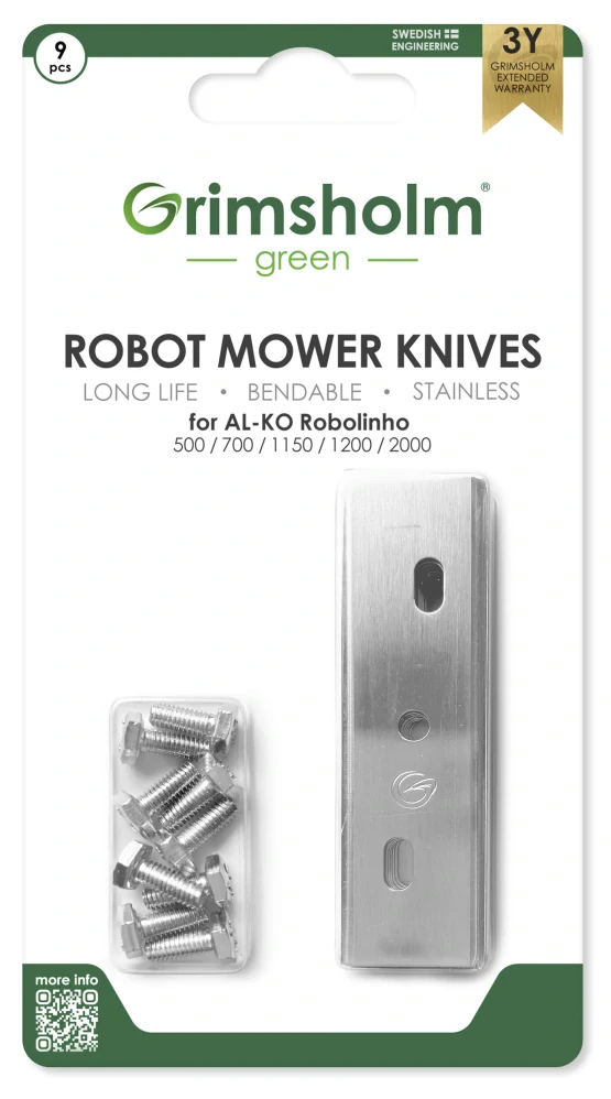 Nože pre robotické kosačky sú vyrobené zo 100% nehrdzavejúcej ocele, pričom je kladený dôraz na zaistenie optimálnej rovnováhy medzi pevnosťou, ostrosťou a celkovou odolnosťou nožov voči opotrebeniu so zachovaním efektívneho výsledku kosenia trávnika. Vďaka ich flexibilite sa nemusíte obávať toho, že by sa čepeľ noža poškodila pri náraze na kameň či iný tvrdý materiál.