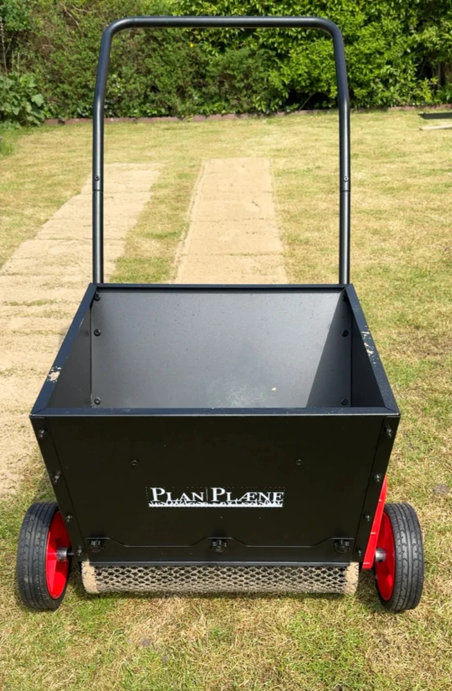 - Jednoduchá manipulácia – Stačí ho naplniť, priviezť na miesto práce na zadných kolieskach, postaviť na všetky štyri kolesá a začať rozmetávať posúvaním dopredu.